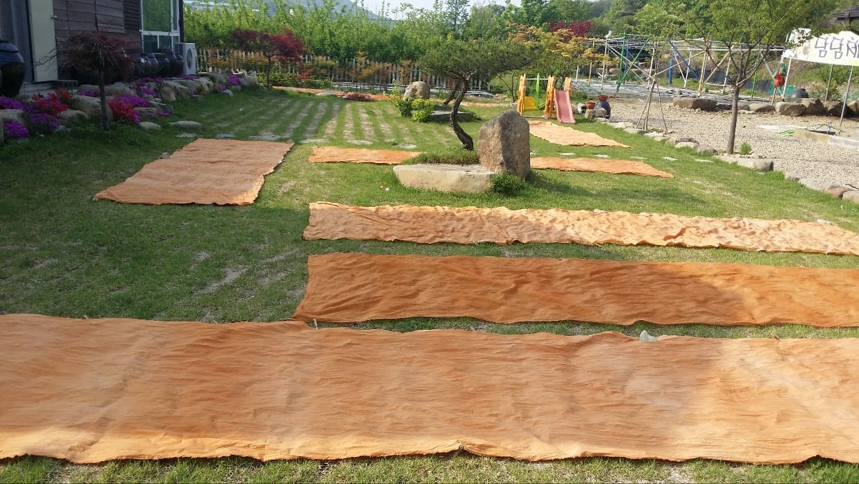 천연재료는 감, 황토, 쪽 품, 오배자, 치자, 대황, 먹물, 양파껍질, 코치닐, 홍화, 소목 등이 있습니다. 이것으로 황토색, 붉은색, 노란색, 푸른색, 연두색, 분홍색 등 다채로운 색을 낼 수 있으며, 실생활에 활용할 수 있는 기념품에 직접 물들인 후 소장할 수 있습니다.