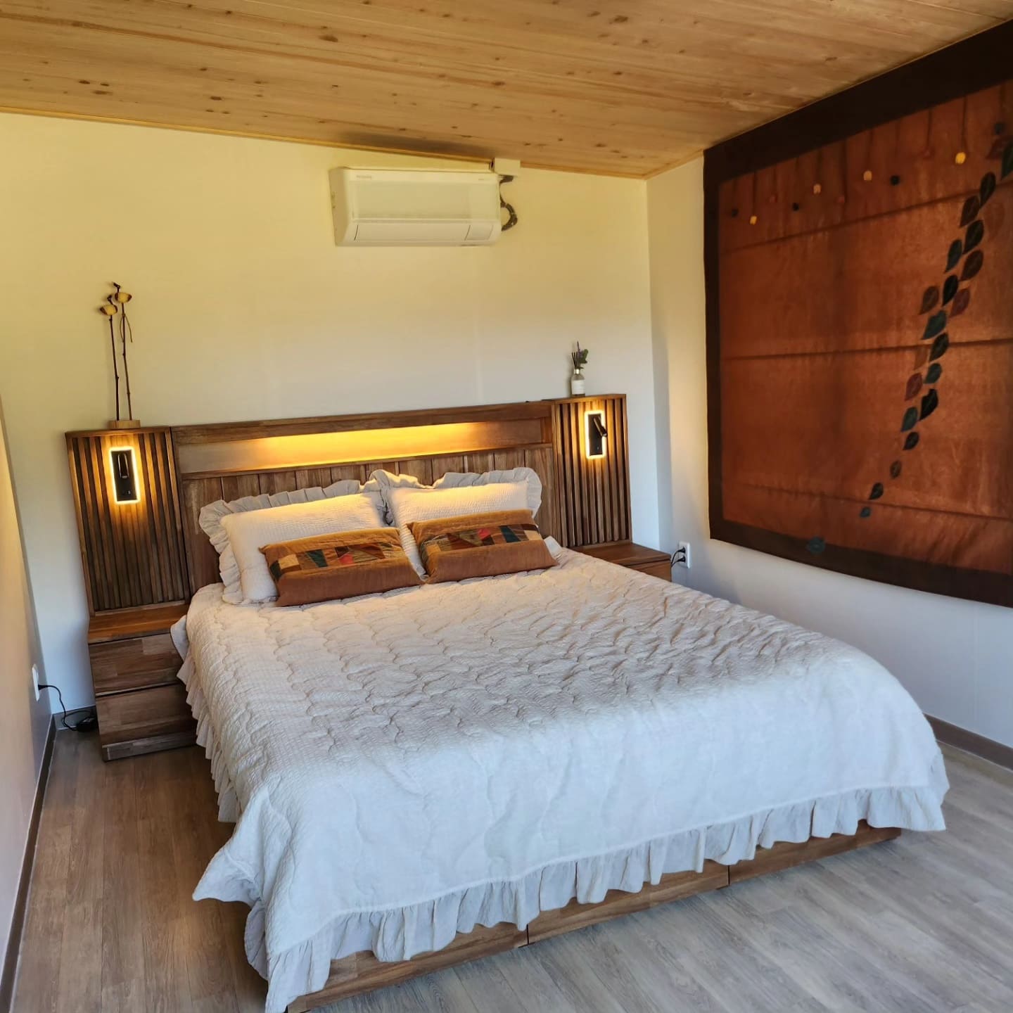 천연 염색 방석과 나무 가구가 함께 어우러진 자역 친화적인 인테리어